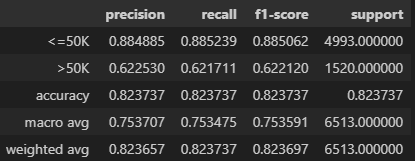 Something interesting to note, is that the model's precision, recall, and f1-score is much lower for ">50K" than it is for "<=50K". The reason for this is because "<=50K" is a much more common result, which means the algorithm "got more practice", and therefore got better, at identifying when someone made less than 50k annually as opposed to more than 50k annually.